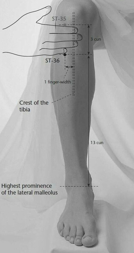Il se situe sur la face antéro-externe de la jambe, à 4 travers de doigts sous la rotule du genou, dans le creux présent sur le côté externe du tibia.